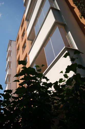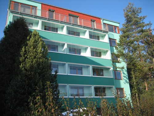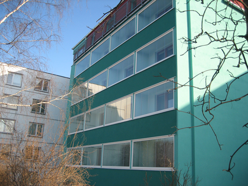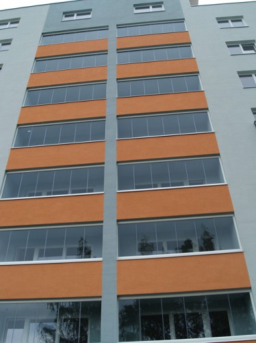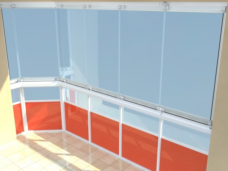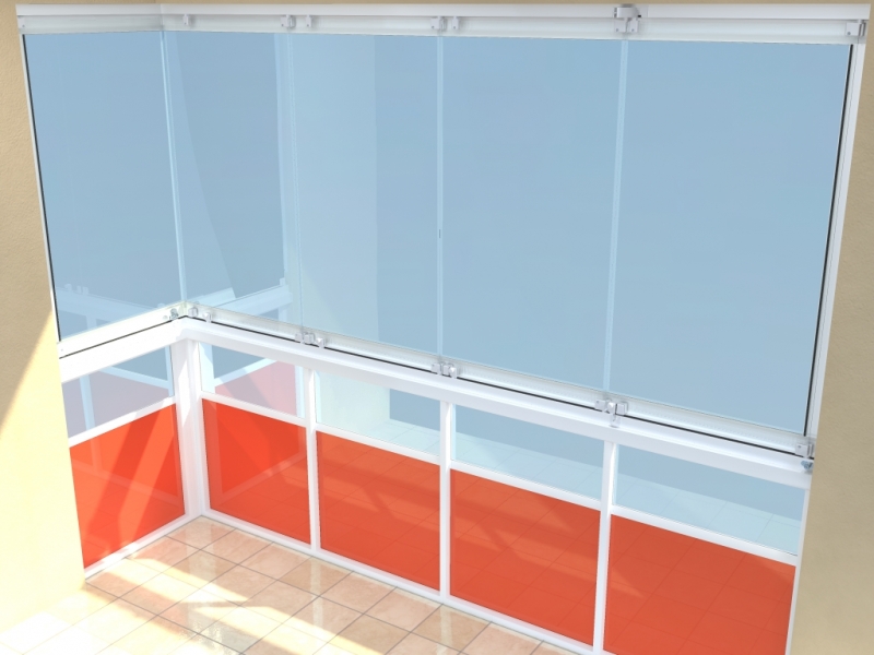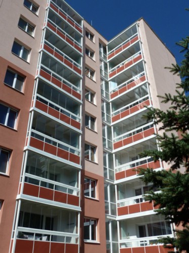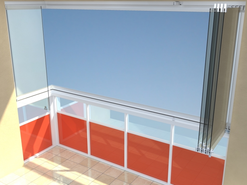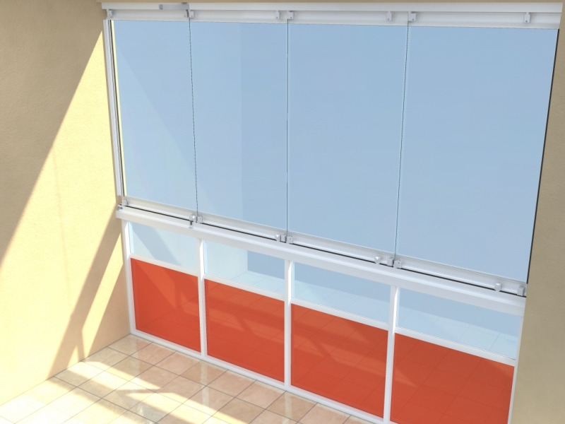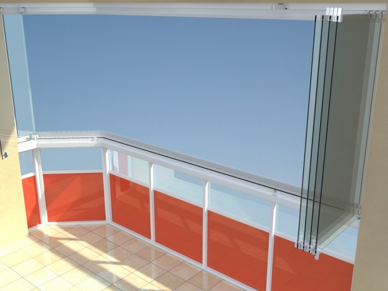 The AluVista frameless glazing system is a sliding and revolving glazing system without vertical aluminium dividing frames. Leaves made of transparent safety glass slide along a bottom rail at the railing height and are guided by a top rail of the same shape (does not interfere with the loggia or balcony interior). Water drainage is provided via drain holes. Special sealing between the leaves and side enclosing profiles guarantees almost perfect tightness of the structure. Vent holes ensure permanent and natural air exchange. The opening method enables safe and comfortable washing. The AluVista system can be complemented with convenient shading by window blinds.